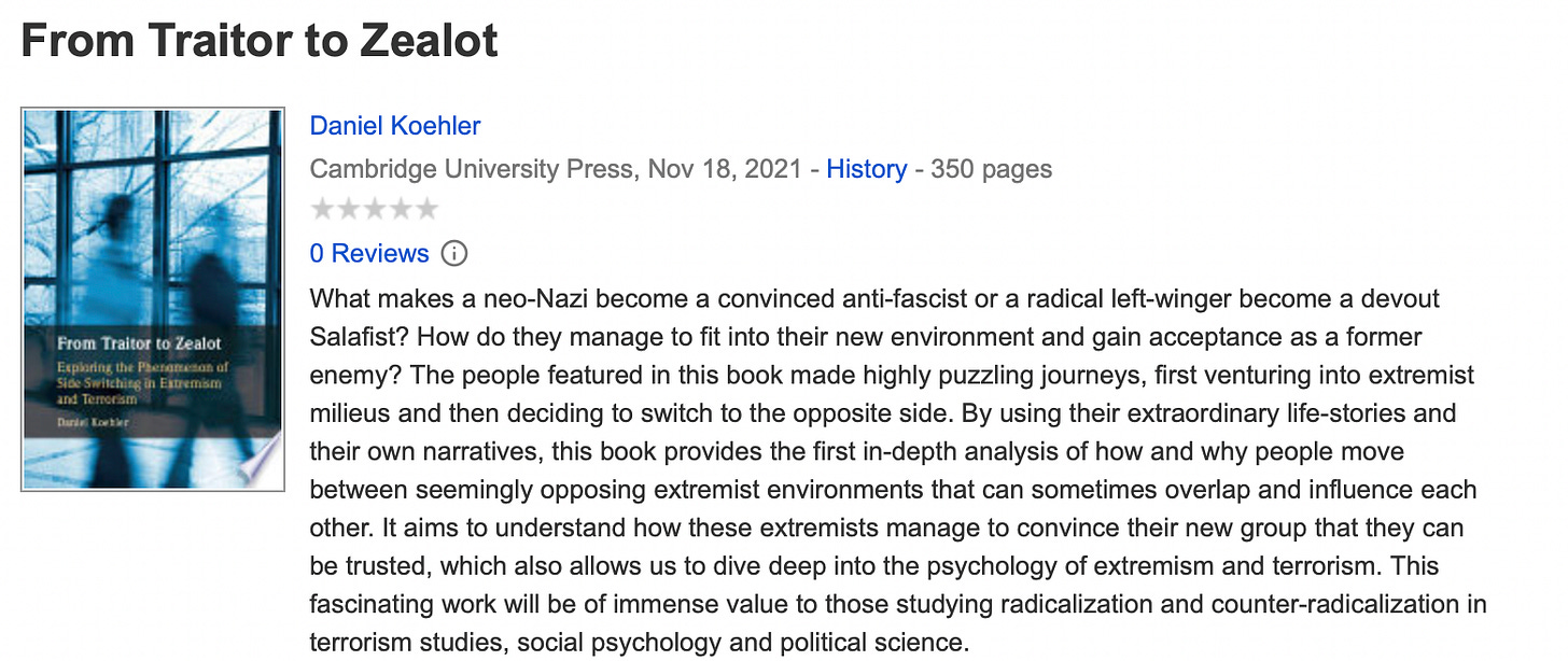 Leaving radicalism is harder than leaving fascism, it seems. There’s a phenomenon of side-switching, where a radical goes from one end of the political spectrum to its opposite. That’s why neo-Nazis will become extremist Muslims, and vice versa. Yup, that’s a thing.